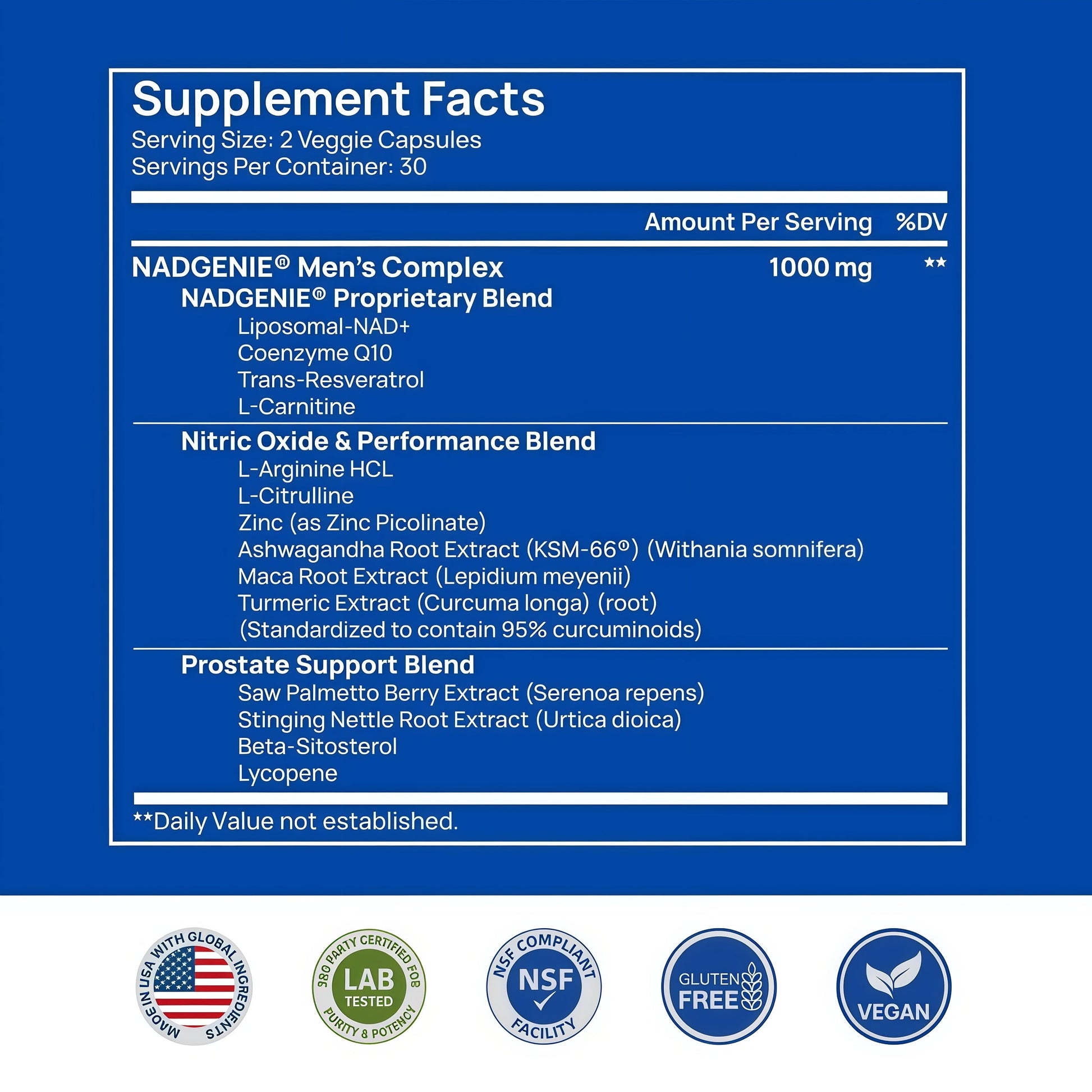 The main ingredients in this supplement are Nicotinamide Riboside, CoQ10, and Niacinamide, which are part of the NADGenie proprietary blend. It also includes turmeric extract, L-Arginine, and other complementary ingredients.